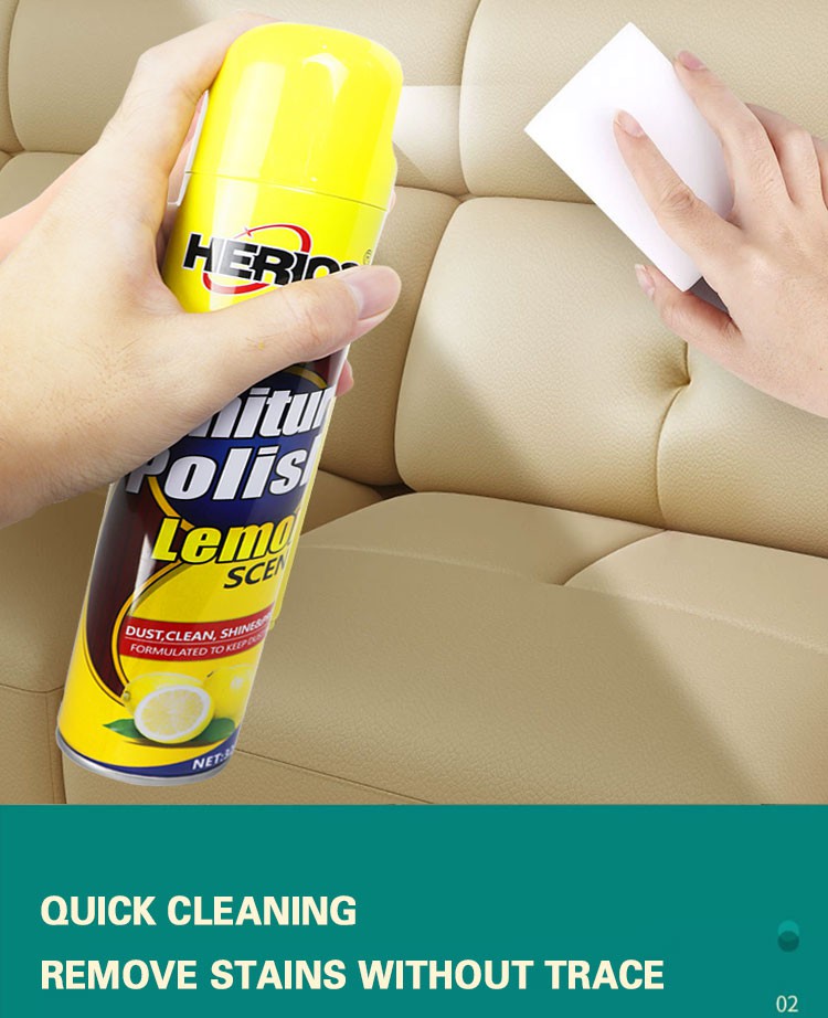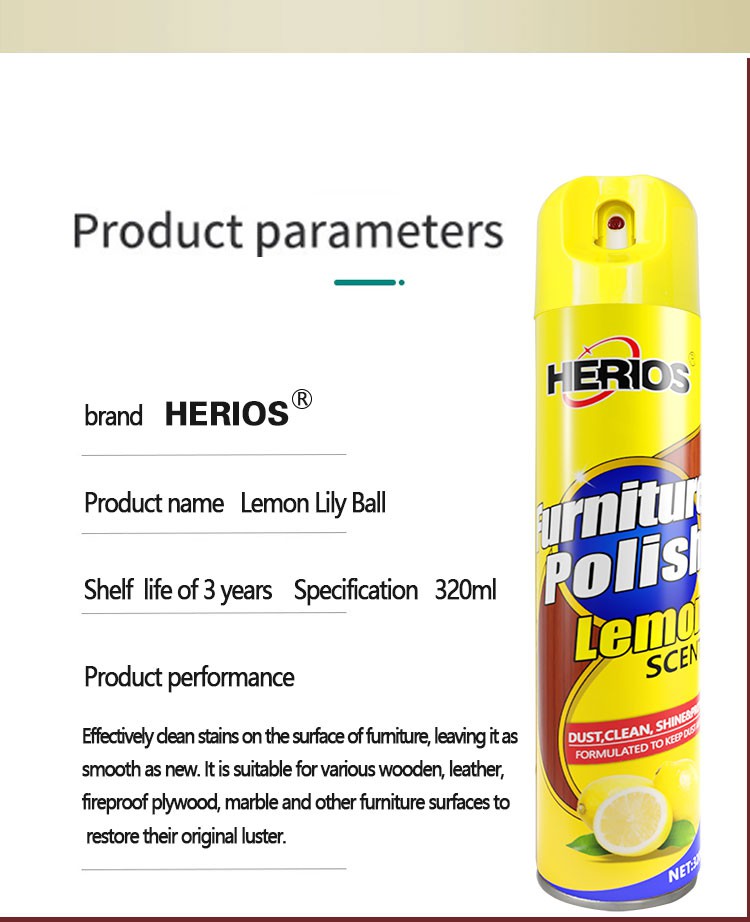 330ml Herios furniture polish aerosol spray is specially used to clean and protect all kinds of furniture, with the function of detergency, de-dusting, gloss finishing, to effectively prevent the surface from wood base, plastic, metal, rubber plates, marble, domestic applicance, musical instrument, dashboard etc.